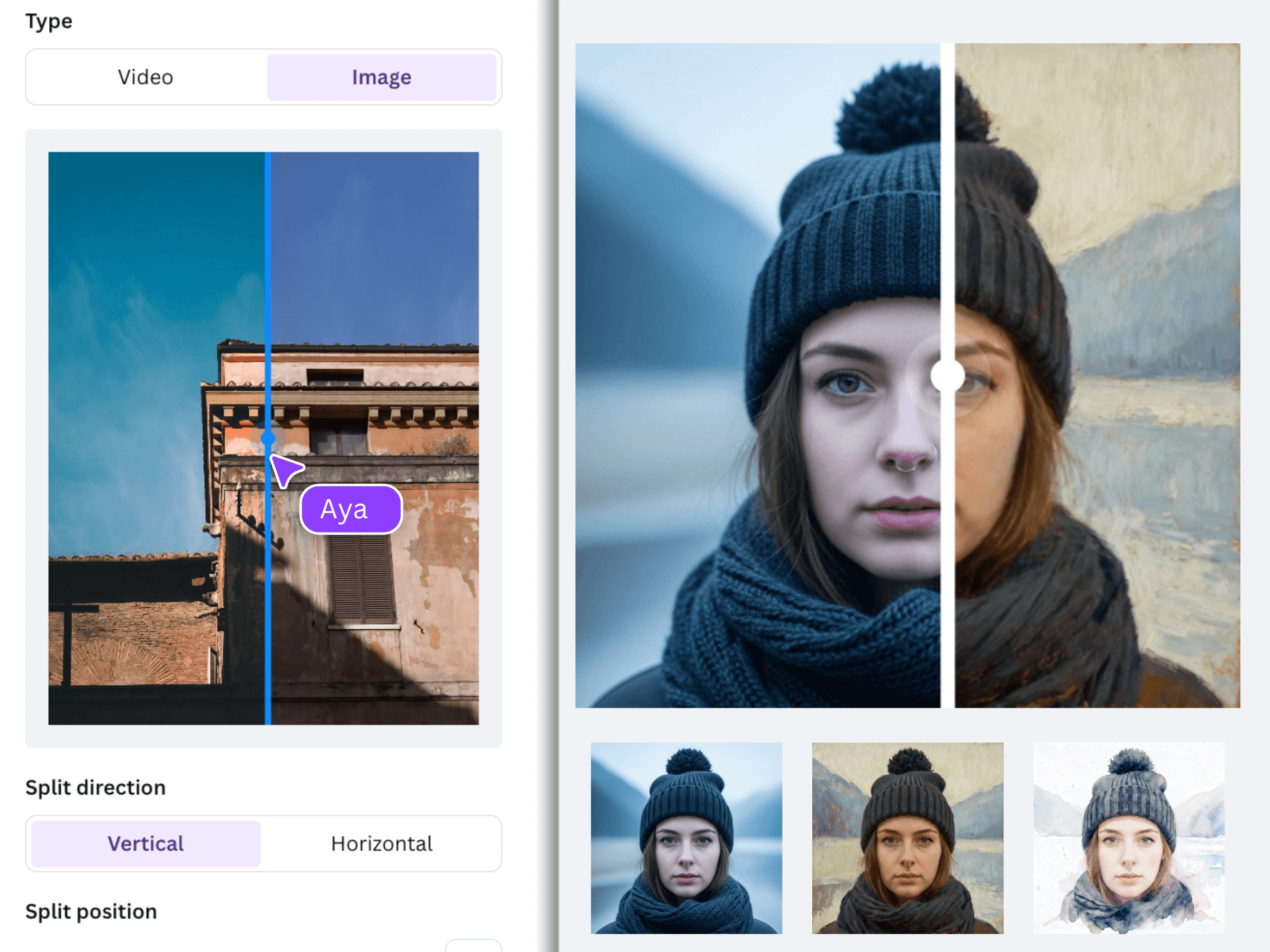 Upload two images and create a before & after comparison. Export as video or image, with slider animation, vertical or horizontal split, and adjustable speed and divider.