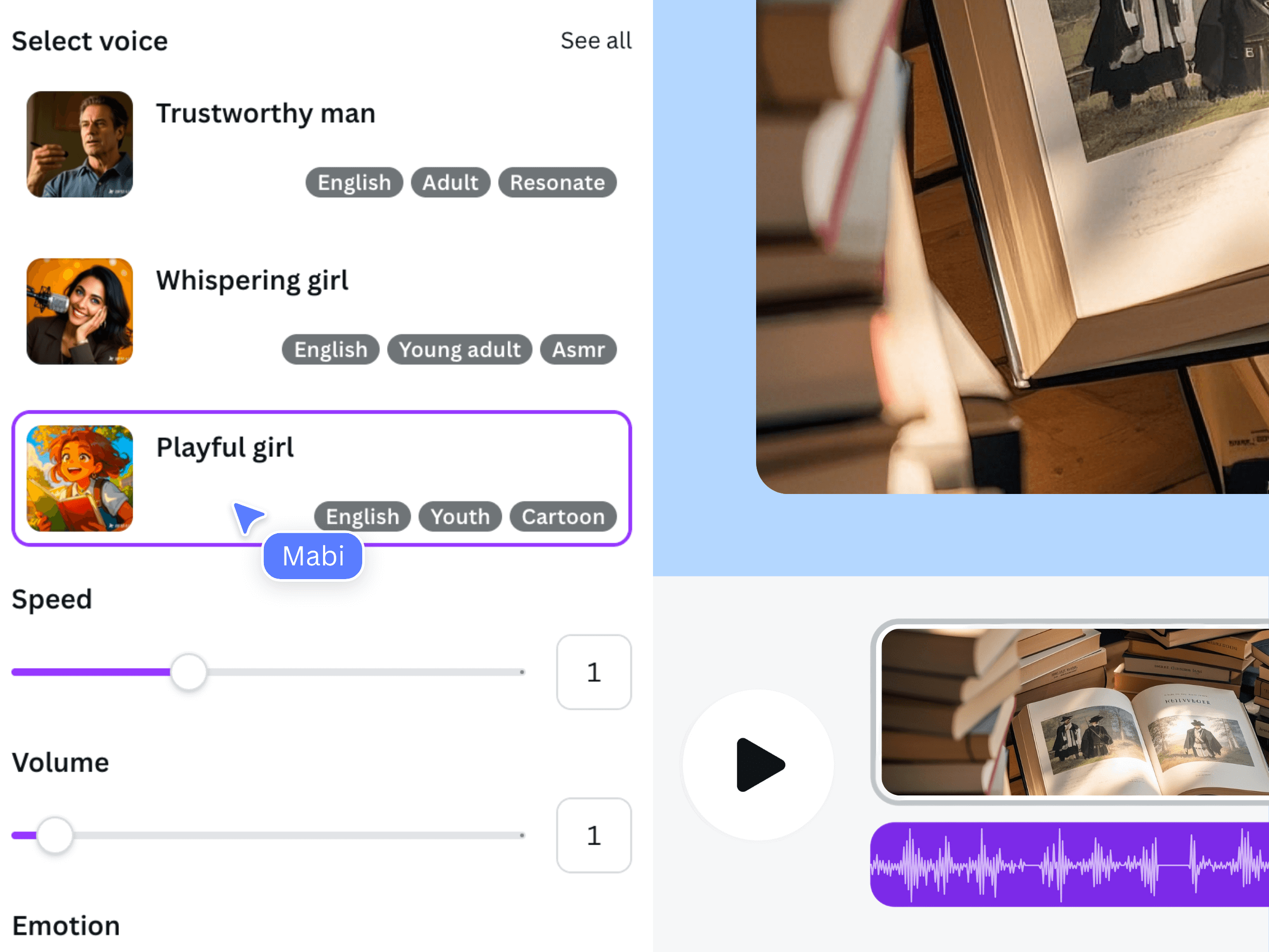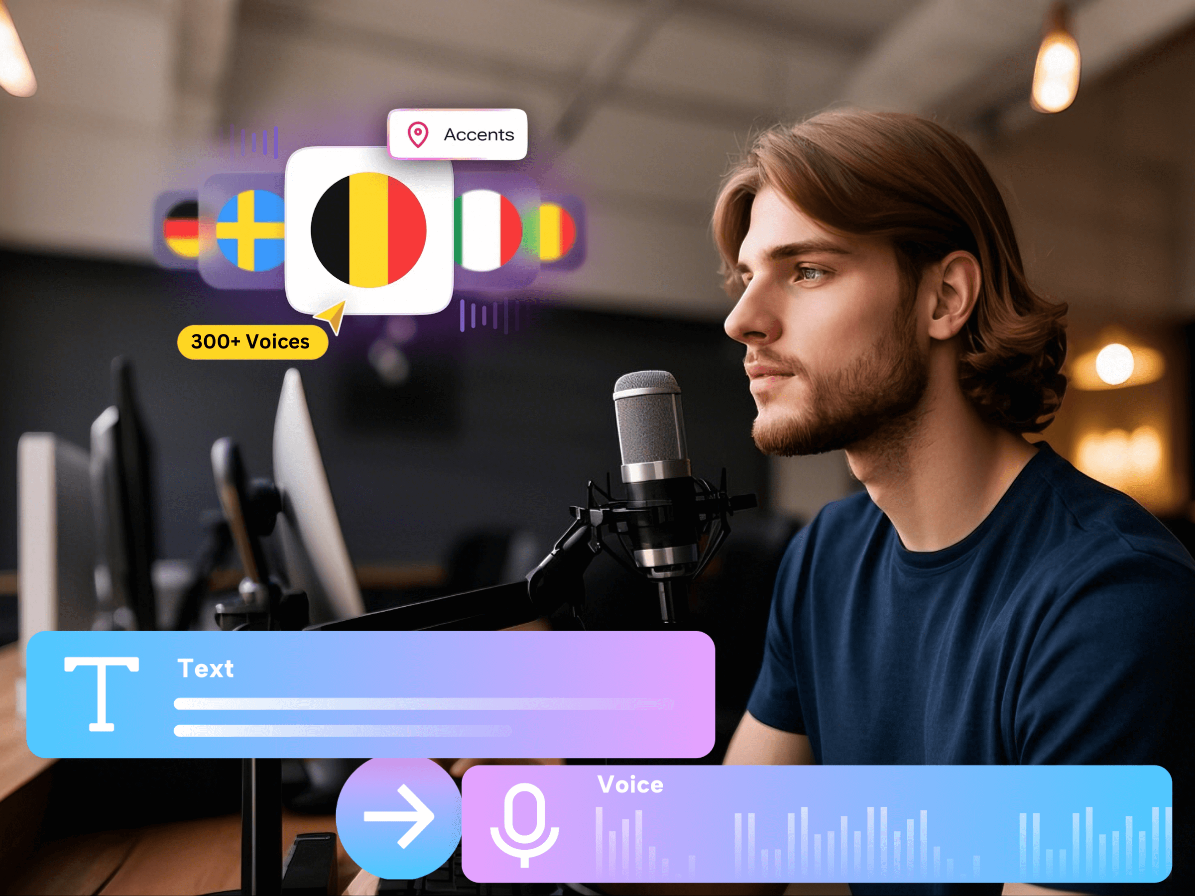 Transform text into studio-quality voiceovers with adjustable speed and emotion. Choose from 300+ AI voices to create perfect narration for your content. Professional results in seconds.